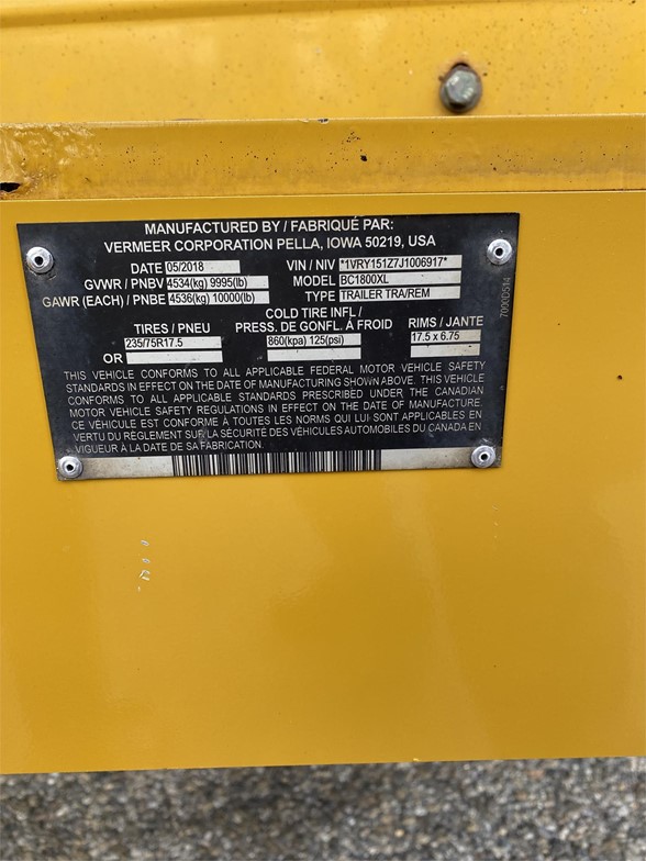 2018 Vermeer BC1800XL features a 165hp PSI gas engine, pintle hitch, manual jack, and a winch!
